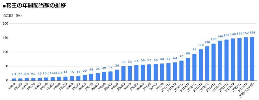 花王株式会社の最大の特徴は、なんといっても36期連続で配当を増やし続けていることです(2025年12月期予想含む)。